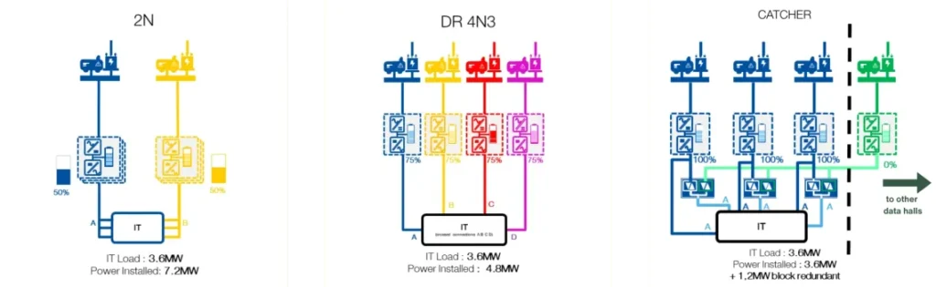 Dans la même philosophie que l’architecture distribuée, le but est de limiter la puissance des systèmes principaux pour limiter l’impact de l’investissement initial et de fonctionnement. Concrètement, le modèle Catcher crée une architecture N+1 ou N+2 au sein de l’ASI (alimentation sans interruption), tout en maintenant la tolérance aux pannes et la possibilité de maintenance simultanée grâce à l’utilisation de STS (systèmes de transfert statique) placés entre l’ASI et la charge.