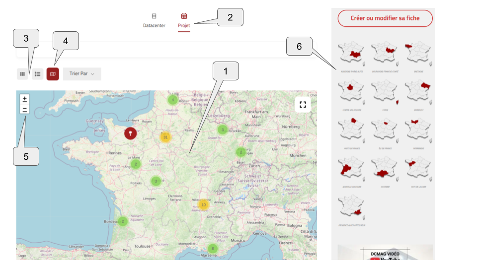- La carte DCmag [1] des projets de datacenters [2] peut être consultée en mode annuaire [3] ou en mode carte [4] avec zoom [5] ou par région [6] .