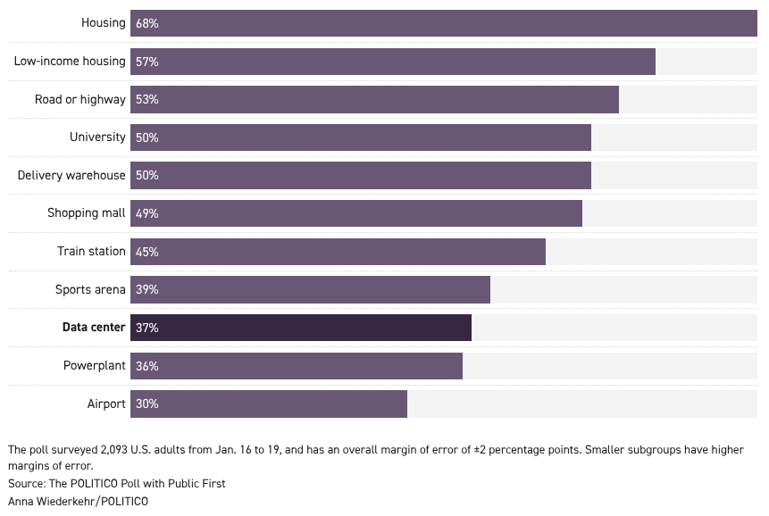 Il a été demandé à un panel d’Américains quelles infrastructures – pavillons, logement sociaux, centre commercial, entrepôts, routes, centrale électrique… et datacenter – ils accepteraient de voir construire près de chez eux ? Voici la répartition des résultats :