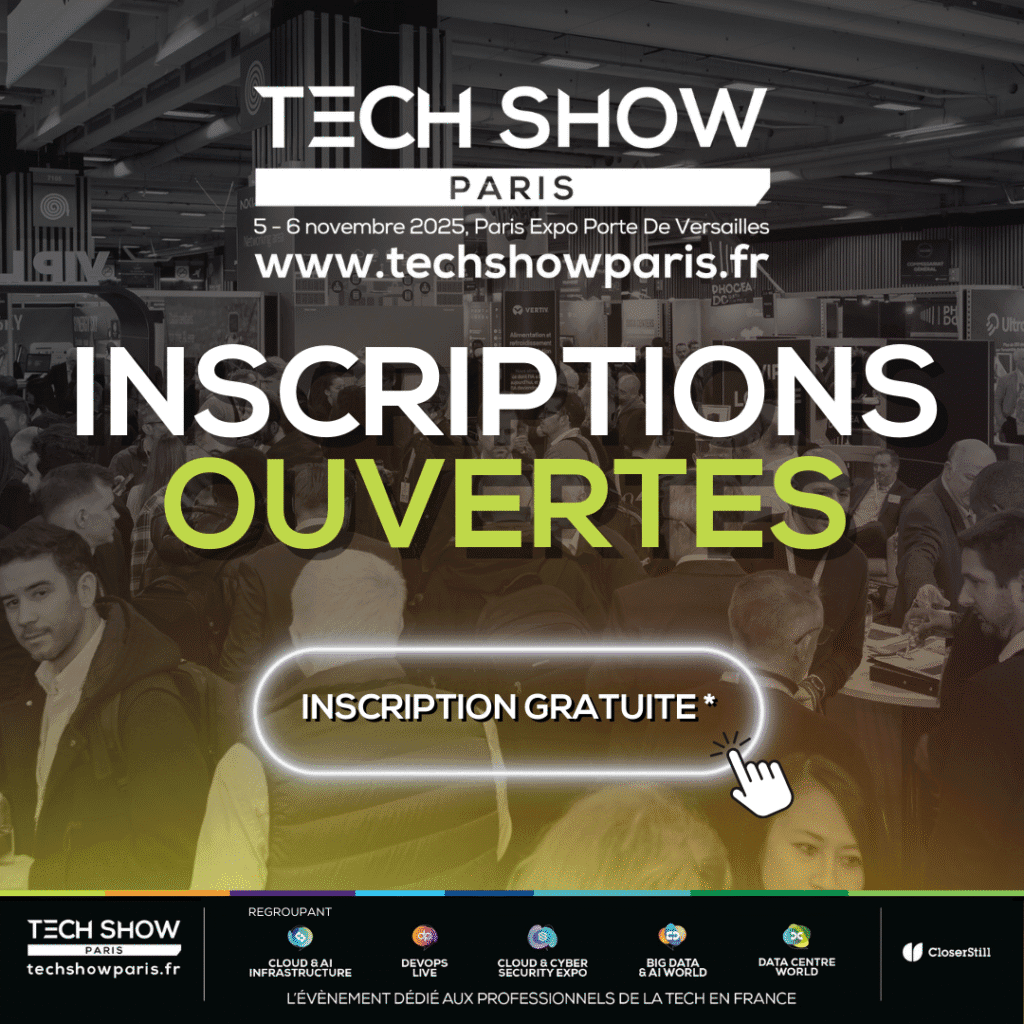 Retrouvez-nous sur la prochaine édition du TechShow Paris, sur le salon Data Centre World Paris 2025, qui se tiendra les 5 et 6 novembre 2025. Pour vous inscrire gratuitement, cliquez sur l’image ci-dessous :