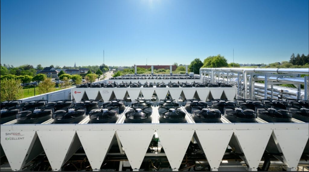 La phase d’exploitation s’inscrit dans une logique d’optimisation énergétique continue. Le refroidissement des serveurs repose sur le free-cooling via une centrale de traitement de l’air chaud, complété par un système hydraulique en circuit fermé, sans consommation d’eau. La chaleur fatale produite par le site sera valorisée à travers un futur réseau de chaleur urbain, tandis que la toiture accueille des infrastructures de production photovoltaïque. Enfin, l’alimentation électrique est couverte à 100% par de l’électricité renouvelable, certifiée par des garanties d’origine.
