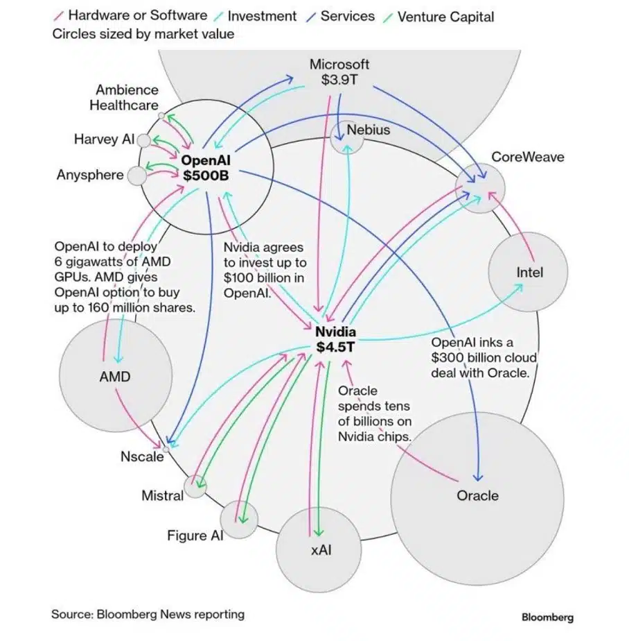 Représentation des valeurs de marché des entreprises du secteur de l’IA. Source : Bloomberg News reporting, 2025