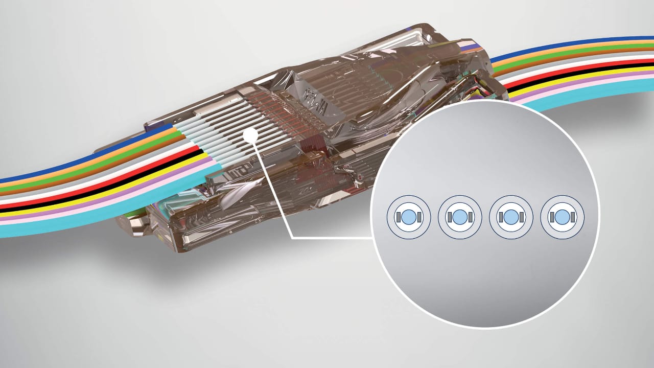 Le défi technique consiste à aligner avec une extrême précision les éléments de contrainte des fibres à raccorder. La moindre déviation peut entraîner des pertes significatives ; une grande précision est donc essentielle pour assurer la qualité du signal. Rosenberger OSI a développé un savoir-faire spécifique dans ce domaine, permettant l’assemblage haute précision de connecteurs multifibres (EBO) avec des fibres PM.